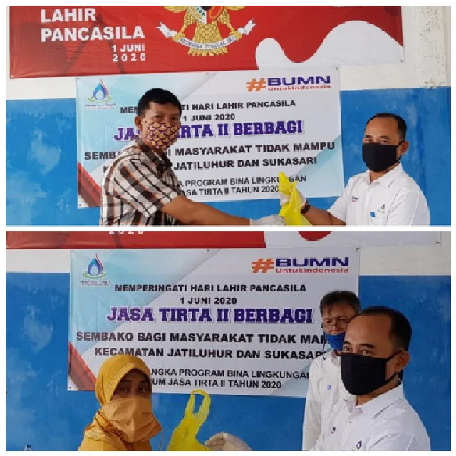 Dalam kesempatan memperingati Hari Lahir Pancasila 1 Juni 2020 di tengah Pandemi penyebaran Virus Covid - 19 kembali Perum Jasa Tirta II berperan berbagi sembako sebanyak 4000 paket yang didistribusikan pada masyarakat terdampak Covid -19 di Kecamatan Jatiluhur dan Sukasari.