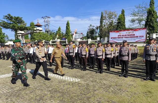 Kapolres Lampung Utara AKBP Teddy Rachesna, S.H., S.I.K., M.Si. mengatakan, hari ini kita melaksanakan Apel Gelar Pasukan Operasi Mantap Praja Krakatau Tahun 2024 guna mengamankan rangkaian kegiatan Pilkada Kabupaten Lampung Utara yang akan berlangsung selama 153 hari.